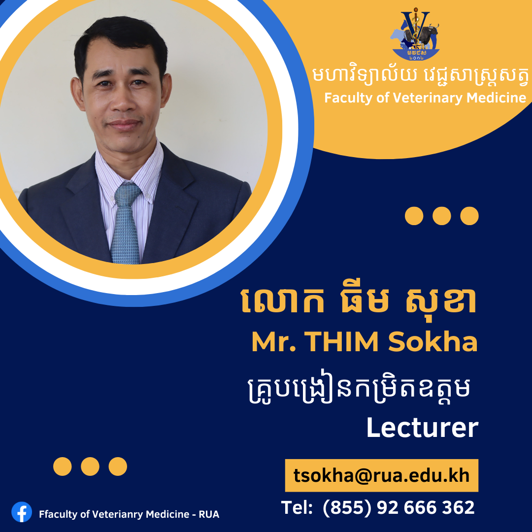 Dr. KIMSAN Sophorn is a lecturer at the Faculty of Veterinary Medicine, Royal University of Agriculture, Cambodia, specializing in animal physiology and theriogenology. Holding a Doctor of Veterinary Medicine (DVM) and a Master’s degree in Animal Science and Veterinary Medicine, he combines scientific expertise with practical experience in animal health and care. Passionate about education, he is dedicated to fostering a dynamic learning environment where students are encouraged to think critically and apply their knowledge to real-world veterinary challenges. His teaching focuses on bridging theoretical concepts with practical applications, inspiring students to develop a deep understanding and passion for veterinary medicine. Beyond the classroom, he remains committed to professional development, continuously refining his teaching methods and staying updated with advancements in the field. His goal is to equip future veterinarians with the knowledge and skills needed to excel in their careers and contribute meaningfully to animal health and welfare. Contact information: Email: sophornkimsan@gmail.com; Tel: (855) 97 666 0141.