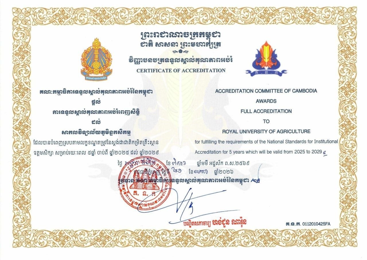 សូមអបអរសាទរ សាកលវិទ្យាល័យភូមិន្ទកសិកម្ម ដែលត្រូវបានគណៈកម្មាធិការទទួលស្គាល់គុណភាពអប់រំនៃកម្ពុជា (ACC) ផ្តល់ការទទួលស្គាល់គុណភាពអប់រំពេញសិទ្ធិ ដែលបានបំពេញស្របតាមលក្ខខណ្ឌតម្រូវនៃស្តង់ដាជាតិកម្រិតគ្រឹះស្ថានឧត្តមសិក្សា សម្រាប់រយៈពេល៥ឆ្នាំ ចាប់ពីឆ្នាំ២០២៥ ដល់ឆ្នាំ២០២៩។