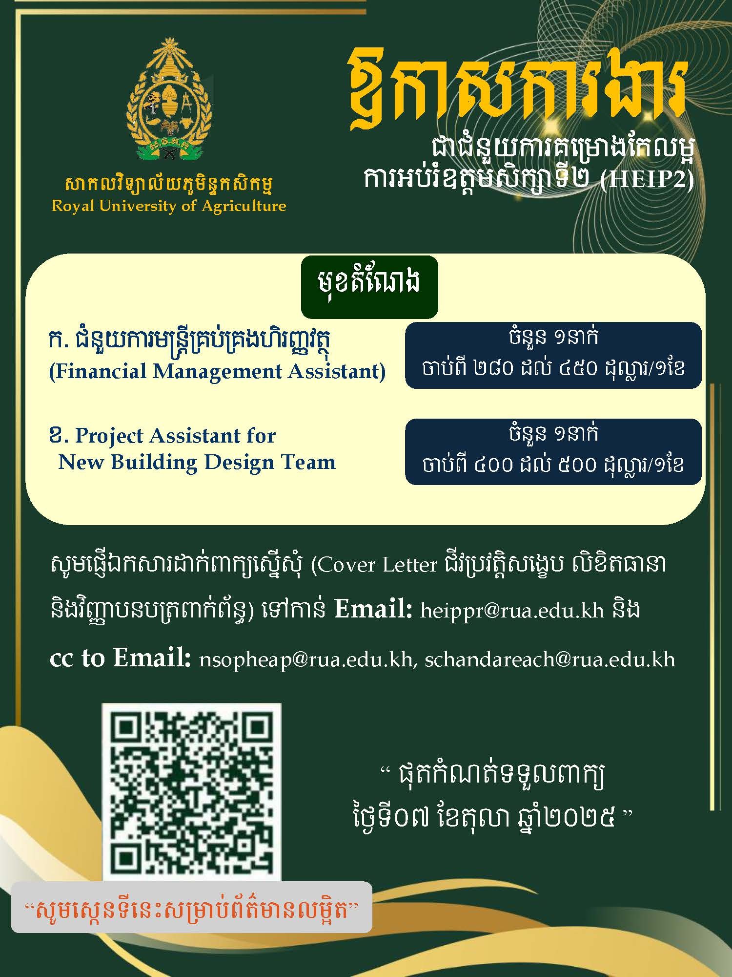 សាកលវិទ្យាល័យភូមិន្ទកសិកម្ម ក្នុងក្របខ័ណ្ឌគម្រោងកែលម្អការអប់រំឧត្តមសិក្សាវគ្គទី២(HEIP2) ត្រូវការជ្រើសរើសជំនួយការ ចំនួន 2 នាក់ ដើម្បីបំពេញការងារដូចខាងក្រោម៖